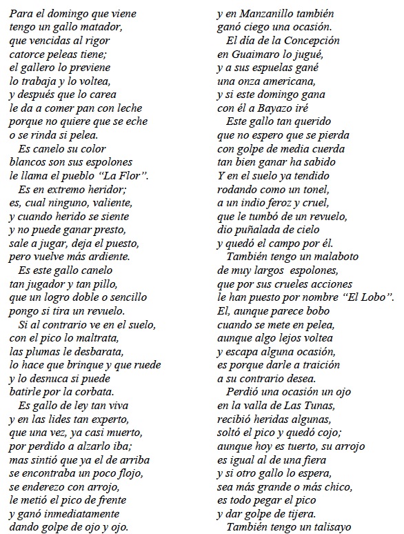 El juego de gallos en Nueva España y Filipinas Juan Hernández Hortigüela La pelea de gallos se remonta a tiempos muy antiguos. Los griegos tenían verdadera pasión por este juego, y era habitual que, tanto jóvenes como mayores, criaran sus gallos para el combate. Los gallos griegos más estimados eran los de Tanagra y Rhodas por estar considerados como los más belicosos; al parecer, les daban de comer, antes de sus peleas, ajos y cebollas para aumentar su combatividad. Temístocles, en una alocución a sus tropas antes de comenzar la batalla de Salamina, alentaba a sus soldados animándoles a comportarse en la batalla, poniendo como ejemplo a los gallos peleando hasta la muerte. ...El origen de los gallos de pelea es muy discutido, pero por los datos que obran en mi poder, los más fiables según mi criterio, es que sean originarios de Asia de las variedades Bankiva y Gallus Sonneratti. Se tienen noticias de peleas de gallos en la India y Persia. Las tribus arias serían las responsables de su llegada a Occidente, en el siglo VIII a. de C. ...Durante la dominación romana de España se celebraban frecuentes peleas de gallos, no teniéndose noticias fiables anteriores a esta época, por consiguiente serían los romanos y griegos los responsables de la aparición de gallos en España. Algunos autores españoles citan a los fenicios como los introductores de los primeros gallos de pelea en España. ...Durante los siglos XVII y XVIII la pelea de gallos se popularizó en Europa, sobre todo en Inglaterra, a pesar de la prohibición de Oliver Cromwell. ...Aunque la mayor parte de los países tienen gallinas de diferentes razas, el gallo de pelea en Hispanoamérica fue importado por los españoles. En las flotas de Indias se llevaban gallos de pelea, de procedencia y crianza española, a toda Hispanoamérica, siendo famosos por su combatividad y bravura los jerezanos. Se sabe que el responsable de la introducción de esta raza de gallos en México fue el mismo Hernán Cortés, gran aficionado que tenía un criadero propio en este país, del cual comentaba con frecuencia, en su correspondencia con Carlos I, la buena marcha del mismo. En Chile fue Pedro Valdivia quien introdujo el gallo de pelea, debido a la gran afición de su esposa, Doña Inés de Suárez, a asistir a las peleas de estas aves. ...Algún autor opina que los gallos de pelea llegaron a Nueva España procedentes China, siendo su puente de enlace las Islas Filipinas. ...Pocos datos más, de relevancia, podemos aportar al origen de estas peleas de gallos, pero lo que si se conoce, por nuestra propia literatura, es que en España se tienen noticias del juego de gallos desde la Edad Media. Estos juegos no se traducían solamente a la pelea como se conoce actualmente, sino a otros juegos, cuyos protagonistas eran los gallos, o gallinas. Alguno de ellos consistía en enterrar al gallo en la tierra hasta el cuello y el participante en el juego, con los ojos tapados, daba mandobles al aire con su espada, siendo ganador si era capaz de cortar el cuello al gallo. Otro juego público consistía en colgar al gallo de una cuerda y un jinete a caballo trataba de cortar la cabeza con su espada. ...Acercándonos al siglo XVI, es conocida la cantidad de animales domésticos que se embarcaban en la flota de indias, destinados a los pobladores españoles, no solamente para su manutención futura, sino para introducir las especies españolas. ...Uno de los graves problemas que se creó en las Indias, durante el descubrimiento y población española, fue el contagio de enfermedades, nuevas para los naturales, que causaron miles de muertos entre la población indígena. Bien al contrario, también los españoles debieron sufrir enfermedades desconocidas, algunas de ellas mortales. Una de las causas de las epidemias que sufrieron los indios, que genéricamente se llamaron pestes, fueron provocadas, principalmente, por los animales domésticos introducidos por los españoles, muy especialmente por los cerdos, gallinas y otras aves. ...Pero, curiosamente este tipo de contagio y epidemia o peste, no se produjo en Filipinas y, si se produjo, no ocasionó tan grave mortandad como en Hispanoamérica. Sin duda, fue debido a que cuando los españoles llegaron a Filipinas, se encontraron con que los filipinos ya granjeaban cerdos y gallinas, entre otros animales, y existió la correspondiente inmunidad a determinadas enfermedades provocadas por el contagio de estos animales domésticos ...Los gallos de pelea españoles fueron muy apreciados en Europa, convirtiéndose en un producto muy apreciado para los juegos, especialmente en Inglaterra (hasta que fueron prohibidos por Oliver Cromwell) y Francia. La raza del gallo español más apreciada era el criado en Andalucía, llamado jerezano, y el extremeño, gallos de prestigio internacional que ha llegado hasta nuestros días y que hoy se continúan exportando y criando, con gran éxito, desde Andalucía. ...españolas, entre ellas el juego de naipes, dados y peleas de gallos, se extendieron pronto por todo el territorio. Lógico es pensar que el Galeón de Manila transportó, entre sus múltiples mercancías, a centenares de estos animales, tanto de Acapulco a Manila como al contrario. ...La afición al juego en Méjico fue siempre muy acusada. Pronto comenzaron los españoles a celebrar fiestas, fueran oficiales o privadas, donde una de las diversiones preferidas era, en general, el juego. El ocio, tanto de naturales como españoles (entre estos muchos religiosos) era la causa de la dedicación a la práctica de toda clase de juegos. ...Pronto las leyes españolas prohibieron en Hispanoamérica los juegos de naipes y dados debidos a los problemas, graves, que se ocasionaban por las discusiones y peleas de los jugadores que llegaban, incluso, hasta ocasionar la muerte. Las peleas de gallos, que se celebraban siempre en las plazas públicas, bajo la atenta mirada de las autoridades, se salvaban de estas restric